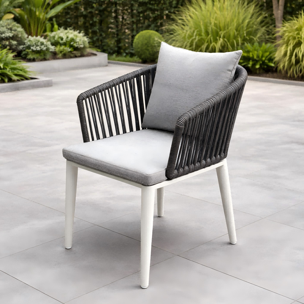 சாப்பாட்டு நாற்காலிகள் ஒரு கயிற்றில் பின்னப்பட்ட பின்னிணைப்பைக் கொண்டுள்ளன, இது வசதியான ஆதரவை வழங்கும் போது நவீன மற்றும் நேர்த்தியான தோற்றத்தை உருவாக்குகிறது. சட்டமானது தூள்-பூசிய அலுமினியத்தால் ஆனது, இது துரு மற்றும் வெளிப்புற வானிலை நிலைமைகளுக்கு சிறந்த எதிர்ப்பை வழங்குகிறது.
